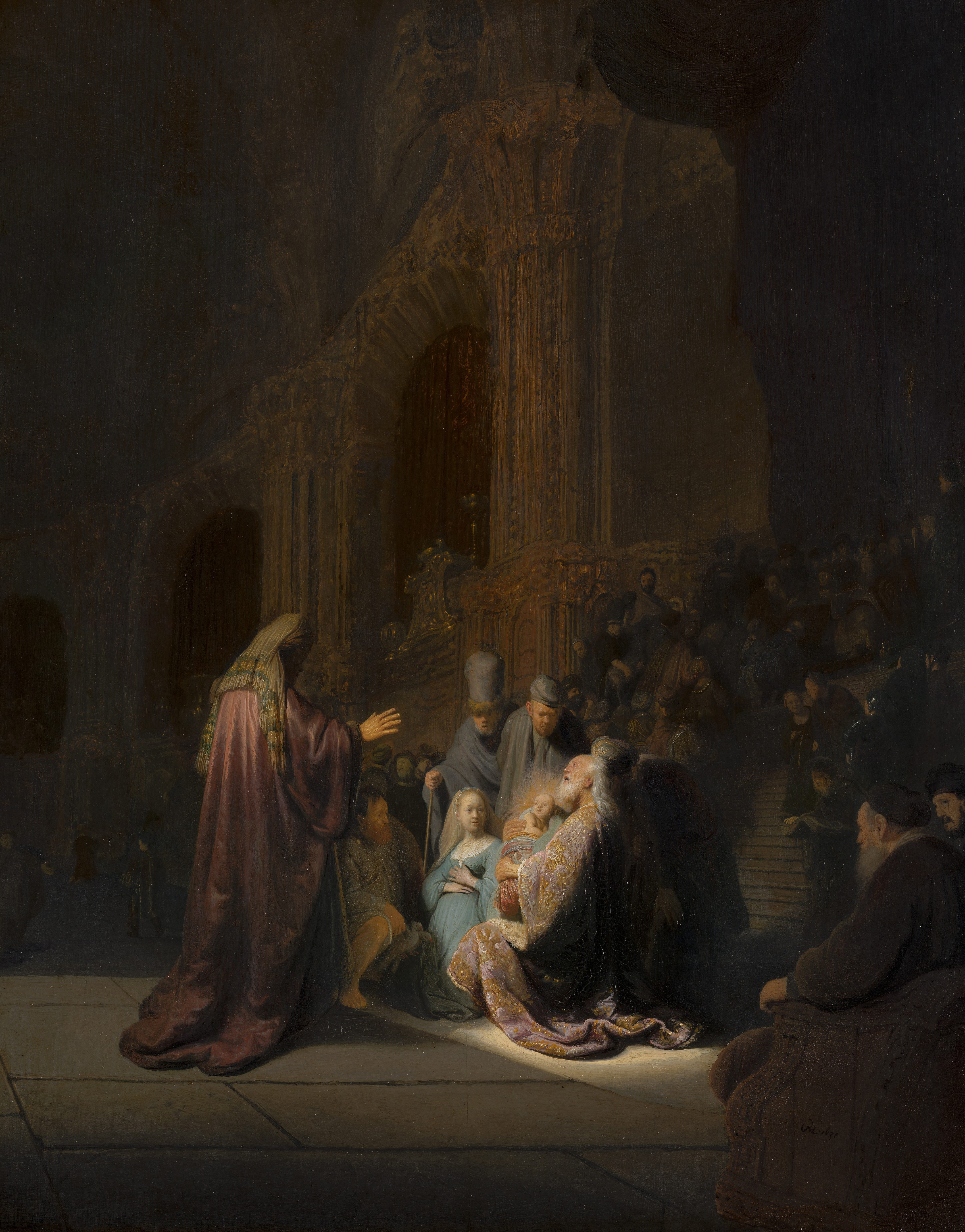 Dit bijzondere en emotionele moment heeft Rembrandt meerdere keren in zijn leven geschilderd, geëtst en getekend. Het lijkt erop dat hij een voorliefde had voor dit verhaal. Hij is nog maar halverwege de twintig als hij in 1631 de bovenstaande indrukwekkende scène schildert. Midden in een monumentale tempel knielen Maria, Jozef en Simeon neer voor een zegenende hogepriester, Jezus ligt in de armen van Simeon. Gevangen in een bundel van licht, heft Simeon zijn hoofd verwachtingsvol omhoog. Het licht dat op hem schijnt, symboliseert mogelijk de goddelijke openbaring. Jezus, omringd door een aureool, straalt. Alsof Rembrandt wilde laten zien: hij is het licht van de wereld.